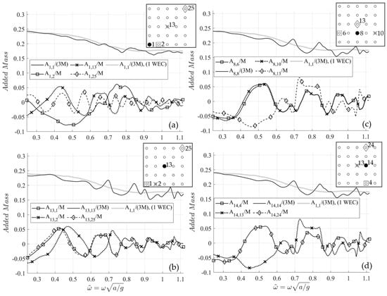 As it can be seen in Figure 9b, the elements and of the added mass matrix present almost identical behavior due to the symmetry of the relevant position of the corresponding devices on the plane. However, minor differences are observed at the low frequency range, which are triggered by the seabed profile. This effect is also evident in Figure 9c, as regards the added mass contributions of the WECs 6 and 10 on WEC 8. On the other hand, the elements and of the added mass matrix behave identically (see Figure 9d), since not only are the relevant positions of these devices symmetric on the plane, but also the devices 4 and 24 are positioned over the same isobath line.