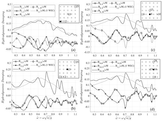 Normalized hydrodynamic damping contributions on WECs (a) 1 (b) 13 (c) 8 and (d) 14. The normalized damping of an individual WEC operating at the same region and located at (position of WEC 13 in the array), is also plotted for comparison. Relative position of the WECs is illustrated in the auxiliary legend.
