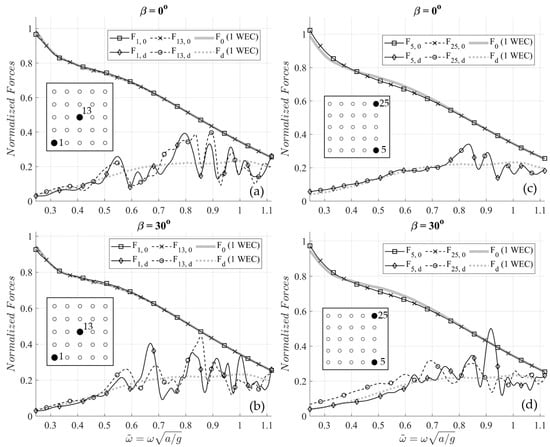 Normalized Froude–Krylov and diffraction forces on WECs (a,b) 1 and 13, (b,d) 5 and 25. Propagation direction (a,c) and (b,d) . The normalized Froude–Krylov and diffraction forces acting on an individual WEC operating at the same region and located at (position of WEC 13 in the array), are also plotted for comparison. Relative position of the WECs is illustrated in the auxiliary legend.