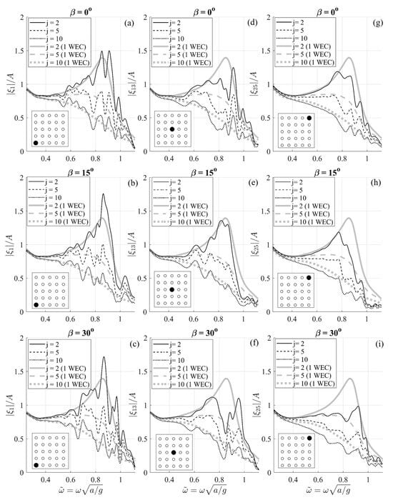 Normalized responses of WECs (a–c) 1, (d–f) 13 and (g–i) 25. Propagation direction (a,d,g) , (b,e,h) , (c,f,i) . The normalized responses of an individual WEC operating at the same region and located at (position of WEC 13 in the array) are also plotted for comparison. The relative position of the WECs is illustrated in the auxiliary legend. , .