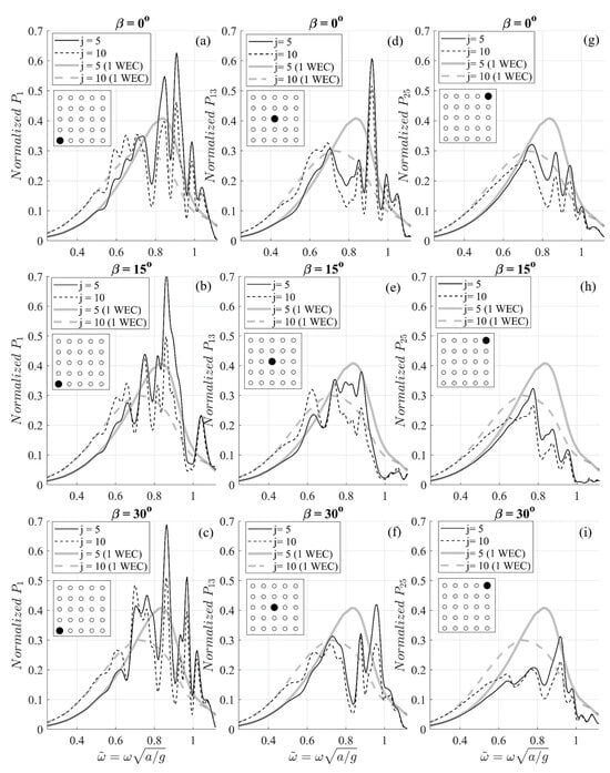 Normalized power output by the WECs (a–c) 1, (d–f) 13, and (g–i) 25. Propagation direction (a,d,g) , (b,e,h) , (c,f,i) . The power output by an individual WEC operating at the same region and located at (position of WEC 13 in the array), is also plotted for comparison. The relative position of the WECs is illustrated in the auxiliary legend. , .