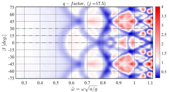 A colorplot of the q-factor is shown in Figure 15, for angles of incidence in the range [], for the optimum value of PTO damping. The sections shown in Figure 14 are denoted by dashed lines in the colorplot.