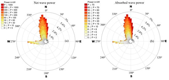 where and represent the normalized power output of the m-WEC, for the given parameters. Polar histograms of net incident and absorbed wave power are shown in Figure 16.