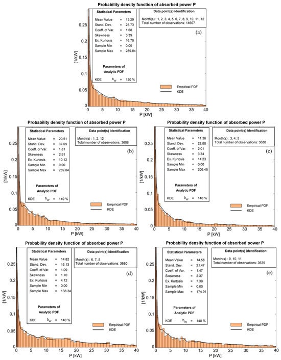 The probability density function of (a) annual and (b–e) seasonal absorbed wave power by the considered 5 × 5-WEC arrangement. (b) Winter, (c) Spring, (d) Summer, (e) Autumn. , .