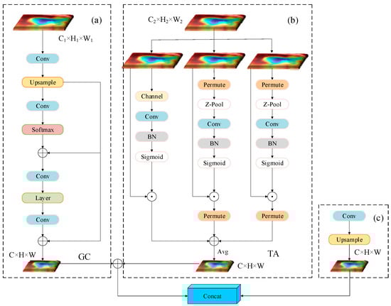 GT feature fusion module. (a) High-level features utilize the GCNet attention mechanism; (b) detailed features employ the triplet attention mechanism; (c) feature information propagated by the FPN.