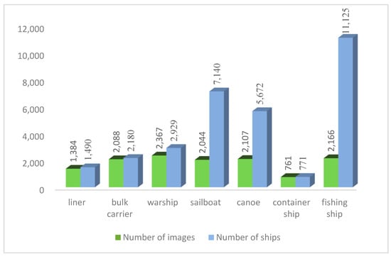 The dataset used in this study is obtained from the InfiRay Infrared Open Platform [], which is an open dataset dedicated to infrared ships. The creation of an infrared dataset requires accurate camera calibration and proper positioning to obtain high-quality and precise infrared images []. This dataset is generated through on-site testing and adjustments, employing a fixed position and stable lighting conditions within the same scene. These measures are implemented to enhance the effectiveness of object detection. The dataset consists of 9402 images of various types of infrared ships along with their corresponding labels. The details of the dataset are shown in Figure 5. The dataset comprises 9402 images of different types of infrared ships, each accompanied by its corresponding labels. The infrared ship categories in the dataset include seven types: liner, bulk carrier, warship, sailboat, canoe, container ship, and fishing boat. Many images in the dataset have low resolutions, with a high count of 4818 images at 384 × 288 resolution and 3472 images at 1280 × 1024 resolution. The resolutions of the remaining images are also all below 640 × 640. During model training, a fixed input size of 640 × 640 will be used. The dataset predominantly captures scenes in coastal ports and docks, where the presence of sailboats and canoes is common on docks, while fishing boats are prevalent in coastal port areas. The dataset contains a significant number of small objects, with fishing boats and canoes being the most frequently occurring types. This also adds a certain level of difficulty to the detection task. In this study, to enhance the reliability of the dataset, corrections were made to some of the labels with errors.