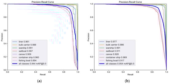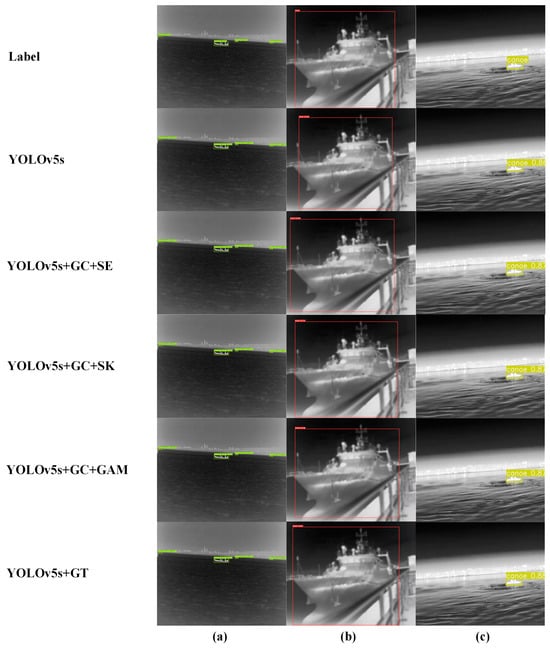 The average precision for each category of YOLOv5s and GT-YOLO is presented in Table 4. Among them, sailboat, canoe, and fishing boat have relatively higher quantities and pose a challenge due to the presence of numerous small targets. Additionally, the detection difficulty is increased as sailboats and canoes are often situated in dock scenes with complex backgrounds, introducing significant interference. Consequently, these three types exhibit lower average precision compared to other ship categories. The initial three types have lower resolutions, mostly at 384 × 288, but with fewer ships in the images and most targets being larger, which are relatively easier to detect.