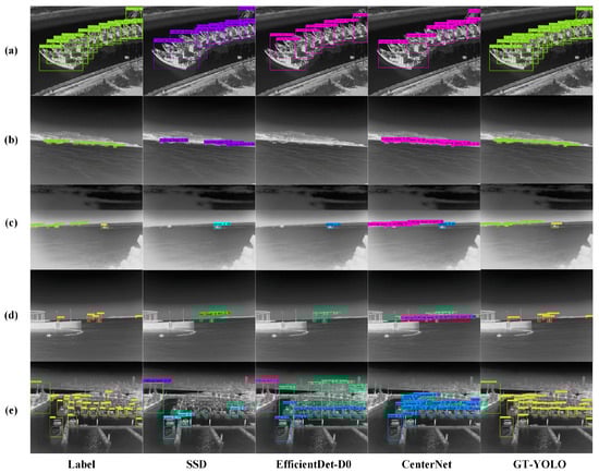 Comparative experiment images; Label represents the original labels; (a–e) depict different scenes for detection. (a) The detection result of fishing boats in close range along the coast; (b) The detection result of the fishing boat in the distant view; (c) The result of ship detection in blurred images; (d) The result of ship inspection at the port exit; (e) The ship detection result in the dock scene.