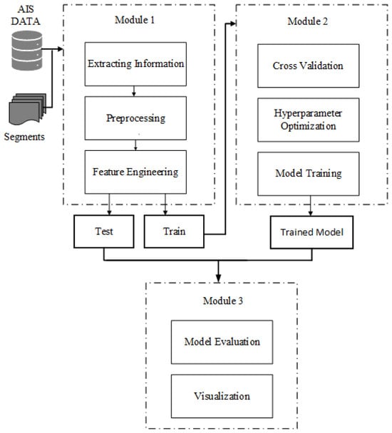 The model proposed in this study consists of three modules. In the first module, AIS data undergo preprocessing, and new features are incorporated into the dataset. The second module utilizes the preprocessed data to train an XGBoost (v 2.0.1) model, incorporating hyperparameter optimization and defining a validation strategy. The final module is dedicated to applying the trained model to a test dataset and comparing the results with the actual travel time. The three modules are illustrated in Figure 1.