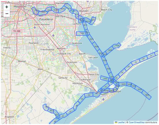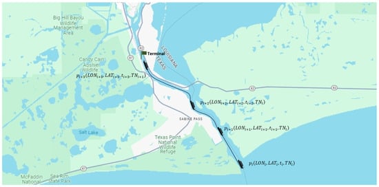 The vessel’s journey from its origin to its destination involves traversing a predefined route. To facilitate the tracking of the vessel’s path, a network of segments is established using a Geographical Information System (GIS) layer, which maps all waterways within the designated Area of Interest (AoI). For this study, the AoI is the Gulf Intracoastal Waterway (GIWW). To segment the waterway, a function in QGIS (v 3.32.3) named “split line to maximum length” is utilized, dividing the channel’s centerline into segments of 2 miles each. As the vessel moves through these segments, the IDs of the segments it passes are captured and stored as features in the database. A schematic representation of this network of segments is depicted in Figure 2.
