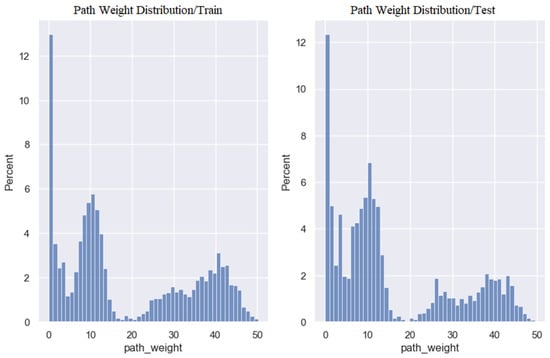 The path weight distribution of the training and test data is shown in Figure 4. As Figure 4 shows, the majority of shipment trips passed through lower-traffic routes. However, there are cases where vessels follow busier routes, leading to increased travel time and, consequently, elevating the significance of the corresponding segments in the estimation of travel time.