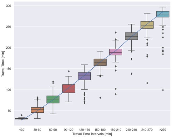 This module assesses the performance of the trained model using a test dataset, which comprises historical AIS data from trips taken during 2019 and 2020. The corresponding performance evaluation is depicted in Figure 7. To construct Figure 7, the travel times of vessels are segmented into 30 min intervals. Within each interval, the average travel time is compared with the distribution of the model’s estimated travel times. As indicated by Figure 7, the model’s estimated time distribution aligns closely with the average travel time for each interval. Notably, the model exhibits greater accuracy for shorter travel durations. However, for longer trips (longer than 180 min), the figure shows that the travel time estimates are more dispersed around the average, indicating reduced accuracy for these longer journeys.