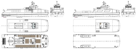 The present design study code capabilities, allowing any type of hullform to be modelled in case of different ship design targets, offer scope for the creation of a wide range of hullforms and provide an optional selection for owners. Combined with the built-in resistance, structure weight, and battery-driven system performance calculations, you have the tools to experiment with shapes and explore design parameters. Accordingly, an extensive fast catamaran series has been created, and a resistance predictor model has been developed on the generated dataset. The case study is a catamaran hull [1,2] as an initial design for database production. The database consists of three tonnages (, , ) tons. Two types of passenger and freight catamaran boats are defined as the initial hullform. The general arrangement of the under-studied catamarans is depicted in Figure 1.
