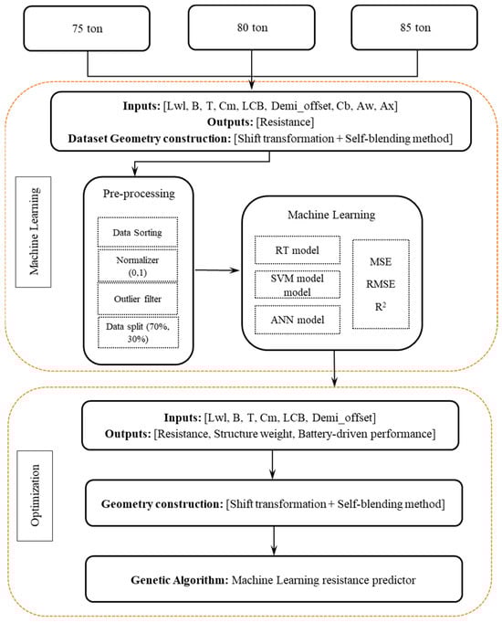 The framework of the design study and machine learning is illustrated in Figure 2. For each tonnage, ship geometry is designed and distributed on the design space according to a multi-level combination of design variables. Performing parametric transformations and self-blending methods creates a series of hullforms with systematically varying parameters, which have been coded in the MATLAB program (R2022b) [21]. Parametric transformation by moving ship sections and self-blending by moving Control Points implement parametric transformations to create new hulls. Accordingly, the design dataset will be prepared for the machine learning process. Outputs of the design study are total resistance, structure weight, and battery weight calculated for each design.