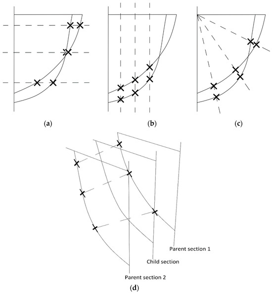 Self-blending of section control points: (a) YZ waterline intersection, (b) YZ Buttock line intersection, (c) YZ diagonal intersection, (d) X direction section blending.