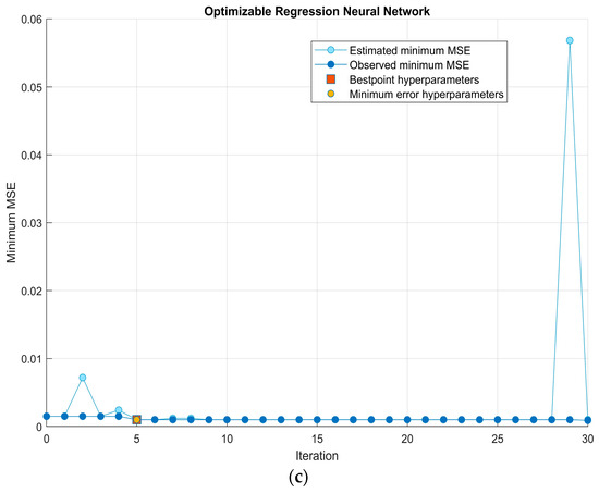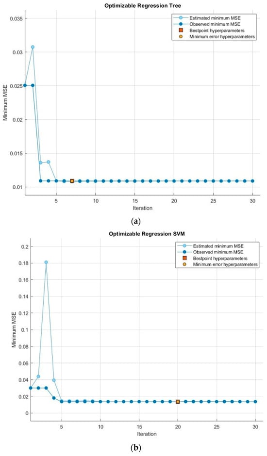 MSE history reduction through the optimizable regression process: (a) Regression Tree, (b) Regression SVM, (c) Regression ANN.