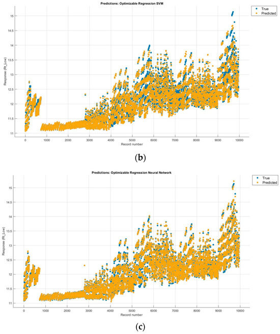 Prediction vs. true design comparison through the optimizable regression process: (a) Regression Tree, (b) Regression SVM, (c) Regression ANN.