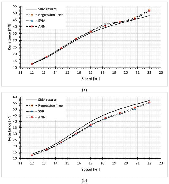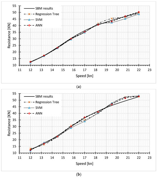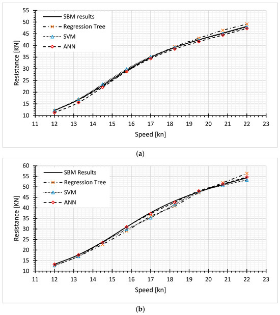 A comparison is conducted between RT, SVM, and ANN methods for evaluating resistance predictors. Two designs from the dataset have been selected randomly for evaluation in this subsection. Figure 7a shows the results for a random hull in the hullform series. In addition, Figure 7b depicts the results for a random catamaran hullform for the 85-ton series.