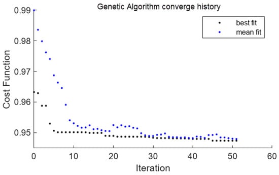 After 51 iterations the optimization terminates. The Genetic Algorithm convergence curve of the current study is shown in Figure 11. The best fit is the best design of each generation, and the mean fit is the average cost function of the population in each generation. Accordingly, 51 × 50 = 2550 designs have been generated in the GA optimization process by using a fast approach ML resistance predictor, which reduces computation cost to a few minutes.