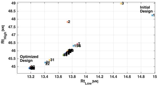 The resistance value of the baseline design at a speed of 12 knots is 14.97 kN, and at speed 22 knots, it is 48.228 kN. According to Figure 12, the results of the optimization process on a 40 m passenger catamaran achieved a 12.2% resistance reduction at cruise speed and a 7.1% resistance reduction at sprint speed. In this Figure, each asterisk point represent best design of each generation during GA optimization process. By using Genetic Algorithm on a sample catamaran ship, it resulted in a 9.5% cost function improvement. Therefore, one can conclude that the developed in-house resistance predictor, combined with hullform optimization software, provides a superior and cost-effective solution for ship design. Resistance and cost function values and their corresponding improvements are presented in Table 9.