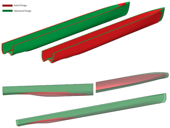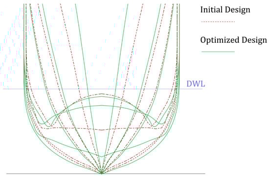 Figure 13 displays the body plan, and Figure 14 shows a perspective view of the initial and optimized hull. Evidently, it can be noticed that the length increases in the bow region of the optimized design. The obtained optimization results illustrate that the forward movement of the start point of the stern bottom improves hydrodynamic performance. The position of the profile view in the bow portion has been elevated, resulting in an alteration of the bow wave pattern.