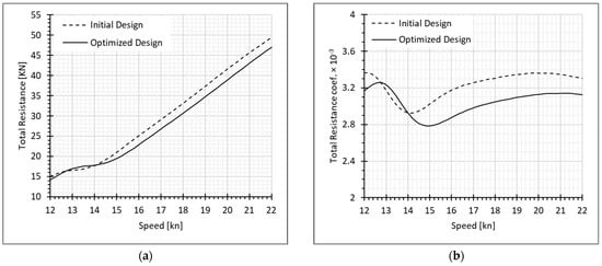 Figure 15a illustrates the resistance plot corresponding to the ship’s velocity for both the initial and optimized hull configurations. Moreover, the graph displays the overall resistance, as well as the coefficients of wave-making and viscous resistance in Figure 15b, Figure 15c, and Figure 15d, respectively. These plots depict lower resistance and its component at different speeds except at speeds between 12.7 knots to 14 knots. The lower value of the wave-making resistance coefficient at hollow and hump regions can be concluded in Figure 15c, and these phenomena occur at speeds higher than initial design speeds.