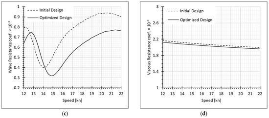 Comparison of total resistance (a), total resistance coefficient (b), wave-making resistance coefficient (c), and viscous resistance coefficient (d) at different speeds between the initial and optimized design.