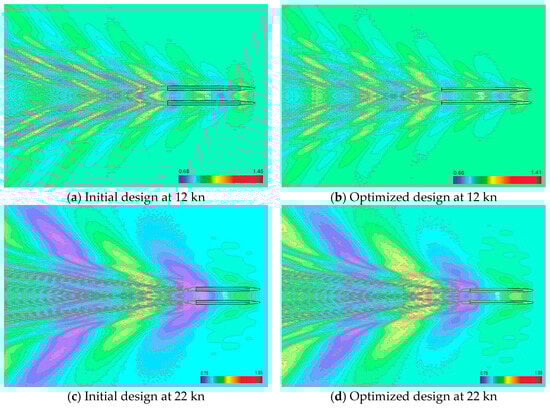 Comparison of wave pattern at (a) Initial design at 12 knots, (b) Optimized design at 12 knots, (c) Initial design at 22 knots, (d) Optimized design at 22 knots.