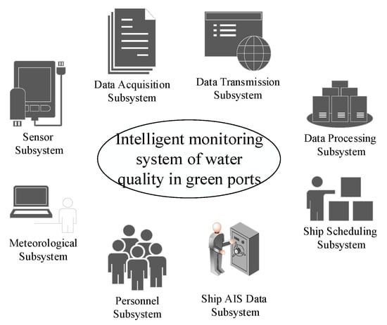 The water quality monitoring system can be functionally divided into the following subsystems: sensor subsystem, data acquisition subsystem, data transmission subsystem, data processing subsystem, ship scheduling subsystem, ship AIS (Automatic Identification System) data subsystem, meteorological subsystem and personnel subsystem (as shown in Figure 1).
