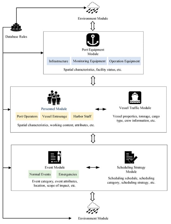 The parallel water quality monitoring system consists of seven modules, named the port equipment module, vessel traffic module, personnel module, environment module, scheduling strategy module, event module and database rules. The relationship between these modules is further illustrated in Figure 4.
