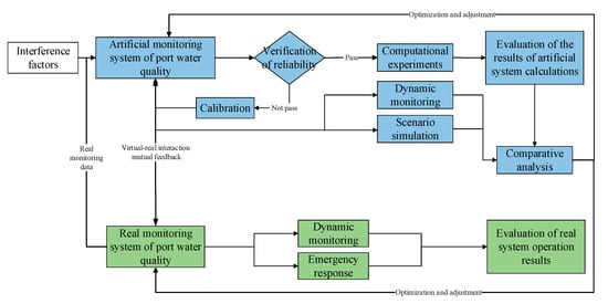 The whole system mainly includes the real monitoring and the artificial monitoring systems of port water quality. These two systems are constantly calculated, inspected and evaluated through data-driven and model-driven models to achieve model controlling, management and training [28]. Both systems interact with each other and run in parallel. Two systems compare and analyse, learn and evaluate their behaviour, and adjust their respective management and control methods to optimize the water quality monitoring system in ports. The main processes are further described as follows: