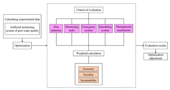 The parallel system based on the ACP method is a complex system of parallel interactions between the real and artificial systems, both of which support each other, as well as the roll optimization and virtuous cycle. The artificial monitoring system of port water quality is an important part of the whole monitoring system and a complete evaluation guide should be designed to ensure that the goal of parallel implementation is successfully achieved. The evaluation process is mainly conducted through three dimensions of economy, sociality and sustainability (as shown in Figure 8).