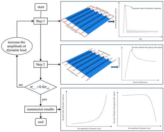 Step 1 of the two-step approach involves calculating the dynamic response of the ship structure under impact load, and step 2 of the two-step approach involves calculating the static ultimate load capacity after impact. Step 1 and step 2 are continuous, and step 2 completely inherits the deformation and stress state of the structure in step 1. It should be noted that step 2 is carried out after the dynamic response of the structure in step 1 becomes stable. The schematic diagram in Figure 2 illustrates the two-step process, using a stiffened plate as an example. The static ultimate load capacity of the stiffened plate is denoted as , and the static ultimate load capacity after impact is . In the application of the two-step approach, it is necessary to increase the amplitude of the dynamic load for continuous iterative calculation. In order to avoid including too many iterations, the static ultimate load capacity after impact is used to limit the number of iterations. In the process diagram, the static ultimate load capacity after impact cannot be less than 80% of the static ultimate load capacity, i.e., . After the calculation is completed, two curves can be obtained: the curve of the peak value of dynamic response with the dynamic load amplitude and the curve of the static ultimate load capacity after impact with the dynamic load amplitude. The two-step approach to determining the dynamic ultimate load capacity will be discussed in detail in the third section.