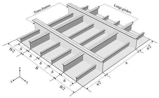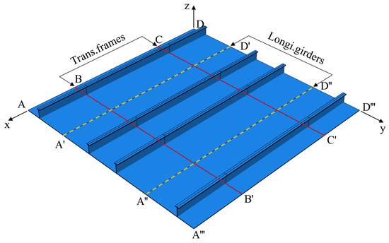 The boundary conditions were based on ISSC 2012 [29]. The transverse frames and longitudinal girders were regarded as constraints and, for simplicity, were not included in the FE model of the stiffened plate, as shown in Figure 7. According to the function for the structure, the transverse frame intersection of C-C′ and B-B′ should restrict the z-direction displacement of plate nodes and the y-direction displacement of the stiffener nodes. The longitudinal girder intersection of A′-D′ and A″-D″ should restrict the z-direction displacement of the plate nodes. The detailed boundary conditions of the stiffened plate are shown in Table 2.