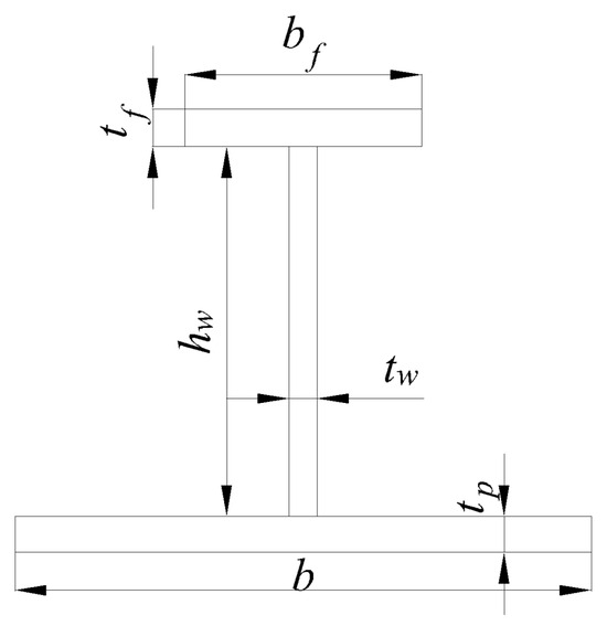 Figure 4 shows the geometric properties of the stiffened plate, where x, y and z correspond to the longitudinal, transverse and vertical directions, respectively. The ‘1/2 + 1 + 1/2 bay & 1/2 + 1 + 1/2 span’ model was used in this study. According to the recommendation of ISSC 2012, using the longitudinal range of ‘1/2 + 1 + 1/2 span’ can bring the boundary conditions of the FE model close to the boundary conditions of a stiffened plate on a real ship, making the results of FE calculation more accurate. The length, the width, the width between stiffeners and the thickness of the stiffened plate are denoted as , , and , respectively. A diagram of the cross-section of the T-bar stiffener is shown in Figure 5. The height and thickness of the stiffener’s web are denoted as and , respectively. The width and thickness of the stiffener’s flange are denoted as and , respectively. The geometric dimensions of the stiffened plate in this paper are shown in Table 1. Three different sizes of plate thickness and stiffeners were used. The plate slenderness ratio is , and the stiffener slenderness ratio is , where is the radius of gyration of the stiffener with full-width (b) plating. is the aero of the cross-section of the stiffener with full-width plating, and is moment of inertia of the stiffener with full-width plating. They are expressed as follows: