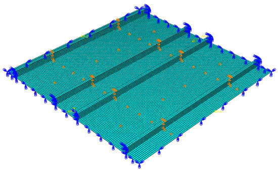 The numerical calculations in this study were conducted in Abaqus 2021. In the process of numerical calculation, Dynamic-Implicit was used in step 1, and Static-General was used in step 2. The element type of FE model is S4R, which is a four-node, double-curved shell. Each node of the element has six degrees of freedom. An FE model of a typical stiffened plate is shown in Figure 9. The nodes at both ends are connected with the corresponding reference points by equation constraints to ensure that the displacements of the reference points and the nodes at both ends are equal in the x direction. In step 1, dynamic impact loads were applied to the reference points; in step 2, forced displacements were applied to the reference points.