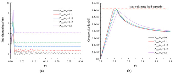 Model 3 was taken as an example to illustrate the calculation process in the two-step approach. The process of applying the two-step approach is similar to that used for other models. When the impact duration , the results obtained by using the two-step approach are shown in Figure 10. The axial displacement of the stiffened plate over time subjected to impact loads with different amplitudes in step 1 is shown in Figure 10a. The axial displacement of the loaded edge can also be called “end shortening”. As shown in the figure, the stiffened plate vibrates after impact and then tends to stabilize. As load amplitude increases, the maximum axial displacement also increases gradually. When , the stiffened plate undergoes almost no plastic deformation after impact. However, when , the stiffened plate undergoes plastic deformation, and as the impact load amplitude increases, the plastic deformation of the stiffened plate increases gradually.