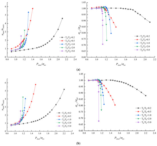 Calculation results from Model 3. (a) The nondimensional maximum axial displacement versus nondimensional load amplitude under impacts of different durations. (b) The nondimensional static ultimate load capacity after impact versus nondimensional load amplitude.