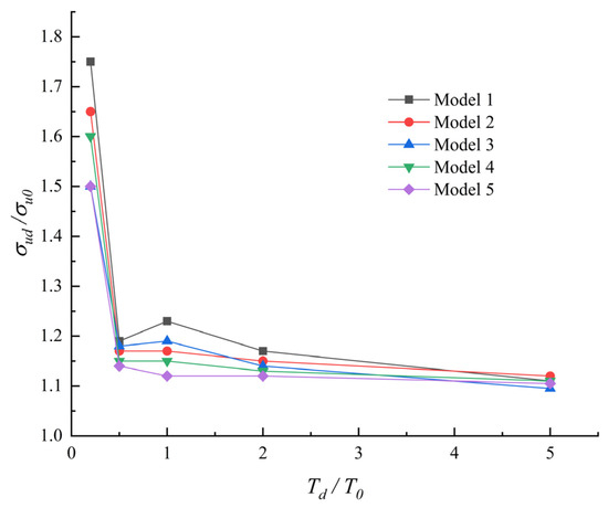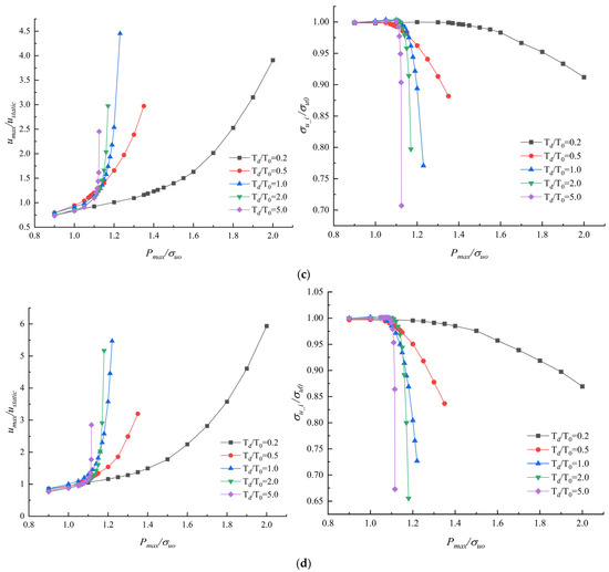 The dynamic ultimate load capacity of each stiffened plate model was computed based on the first vibration period, considering 5 different impact durations: 0.2T0, 0.5T0, T0, 2T0 and 5T0. According to the calculation procedure of the two-step approach, the maximum value of the dynamic response of the stiffened plate was recorded in step 1, and then the static ultimate load capacity after impact was recorded in step 2. The peak value of the dynamic response is the maximum axial displacement of the loaded edge, i.e., . The maximum axial displacement of the stiffened plate under static ultimate load capacity is . Thus, the nondimensional maximum axial displacement is defined as . The static ultimate load capacity of the stiffened plate after impact is denoted as . The nondimensional static ultimate load capacity after impact is defined as .