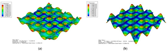 According to the procedure of the two-step approach, the calculation results from the other models are shown in Figure 12. The dynamic ultimate load capacity of each model under different impact durations is shown in Figure 13. As the impact duration increases, the dynamic ultimate load capacity of the stiffened plate gradually decreases. By observing the calculation results of Model 1 in Figure 13, we find that the dynamic ultimate load capacity is obviously smaller when . Moreover, we observe the curve of the nondimensional maximum axial displacement versus nondimensional load amplitude of the stiffened plate in Figure 12a, and we find that the nondimensional maximum axial displacement corresponding to is the largest when . The cause of this phenomenon may be that higher-order deformation modes are activated under short impact duration. Figure 14 shows the displacement distribution at dynamic ultimate state of Model 1 with and the vibration mode with 103.36 Hz. As shown in Figure 14, the displacement distribution and vibration mode of the stiffened plate are similar. And the vibration period is about when frequency is equal to 103.36 Hz, which is close to the impact duration . Therefore, when , the impact load activates the high-order vibration mode of the stiffened plate, causing the resonance of the stiffened plate, thus the axial displacement of the stiffened plate increases significantly.