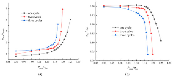 Calculation results of two-step approach under different numbers of impact load cycles. (a) The nondimensional maximum axial displacement versus nondimensional load amplitude. (b) The nondimensional static ultimate load capacity after impact versus nondimensional load amplitude.
