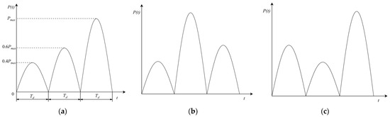 Real ship structures may be subjected to continuous impact loads with different amplitudes. Therefore, it is meaningful to study the dynamic ultimate load capacity of ship structures under continuous impact. We assume that the stiffened plate is impacted three times continuously, each time with different amplitudes. As shown in Figure 19, there are a total of six different sequences of the impact load s. The duration of each impact is denoted as . The three amplitudes of the impact load are , and , respectively. For ease of recording, the sequence of the impact load s is written as 1, 2, 3. For example, the sequence of the impact load amplitudes in Figure 19a is , , , which can be denoted as “A-123”.