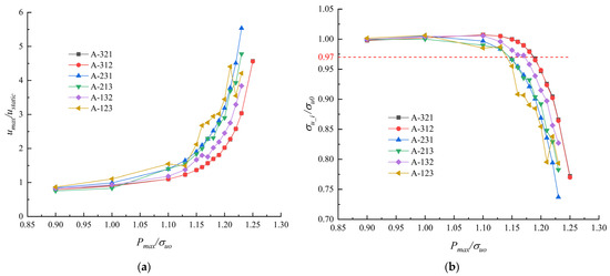 Calculation results of two-step approach under different load sequences. (a) The nondimensional maximum axial displacement versus nondimensional load amplitude. (b) The nondimensional static ultimate load capacity after impact versus nondimensional load amplitude.