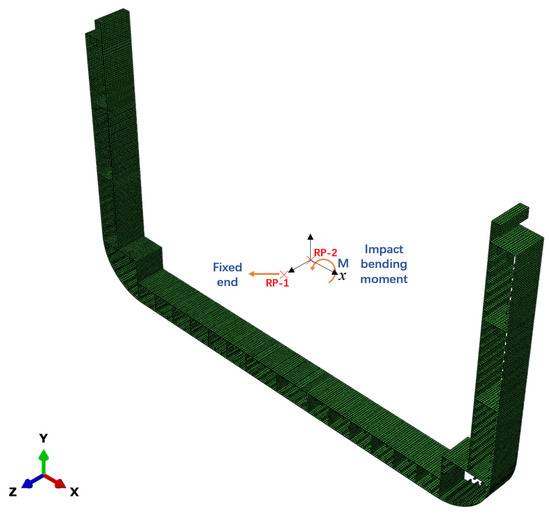 In order to illustrate the applicability of the two-step approach to other ship structures, the two-step approach was used to calculate the dynamic ultimate load capacity of a hull girder. Figure 21 shows the schematic diagram of a single-frame model of a container-ship hull girder. The two reference points (RP-1 and RP-2) and all nodes at both ends of the model are coupled by coupling constraints. Both the boundary conditions and the impact bending moment are applied to the reference points. One end of the model is fixed, and the other end is subjected to impact bending moments. The shape of the impact bending moment is also half-sinusoidal, as shown in Figure 8. According to the natural vibration period of the single-frame model, is selected as the calculation case and the dynamic ultimate load capacity of the hull girder in the sagging state is calculated.