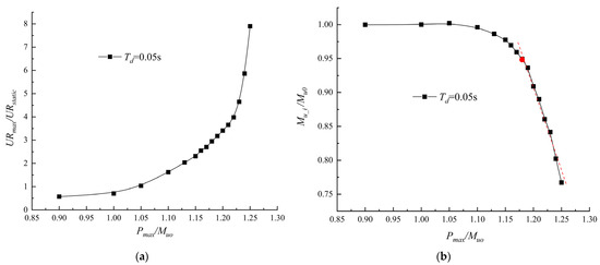 Figure 22 shows the results of calculating the dynamic ultimate load capacity of the hull girder by the two-step approach. From the trend shown by the curve in Figure 22b, it can be determined that the dynamic ultimate load capacity when is and that the static ultimate load capacity after the impact is reduced by 5%. In practice, ship designers can determine the percentage reduction in static ultimate load capacity after impact (e.g., 8% or 10%) according to their experience and needs. Therefore, the two-step approach can also be used to determine the dynamic ultimate load capacity of the hull girder.