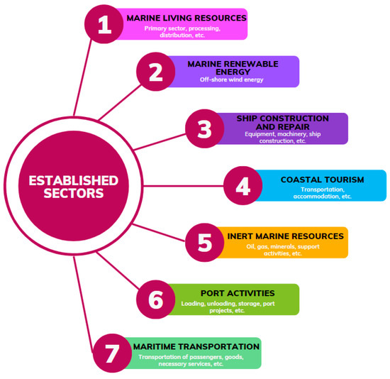 In the European context, the European Union (EU) annually issues a report entitled the Blue Economy Report [8] 2021 as a sign that the B.E. has become a priority on the policy agenda. The European Commission has identified 14 main sectors of the B.E., which are divided into two main groups: established sectors and emerging sectors.