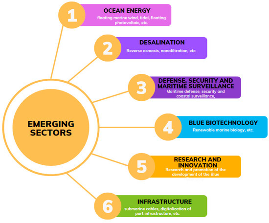 Emerging sectors are defined as those sectors that are novel in the field of the B.E., referring to those activities that are directly linked to the marine environment whose environment has not reached a certain degree of maturity or where data are not available in the public domain (Figure 2).