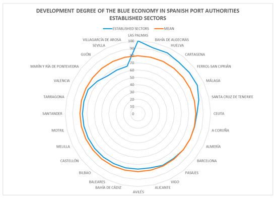 An analysis of the global data on the implementation of the B.E. in Spanish ports (Table 3 and Figure 8, Figure 9 and Figure 10) shows that this implementation has an average of 78% throughout the system. Above this average are 13 of the 28 port authorities, with Las Palmas standing out in first place due to its development of projects related to each of the 13 sectors evaluated. This port obtained the highest score in the evaluation of both established and emerging sectors. These records are justified by the fact that Las Palmas is an island port, located in the Canary Islands. It has a strategic position in the Atlantic for north–south connections, and it enjoys high strategic differentiation as it is currently developing projects in each of the dimensions evaluated, from the promotion of tourism to the development of off-shore renewable energy, through the construction and repair of ships. In addition, its port authority is actively promoting high economic dynamism.