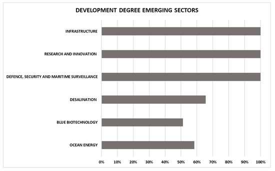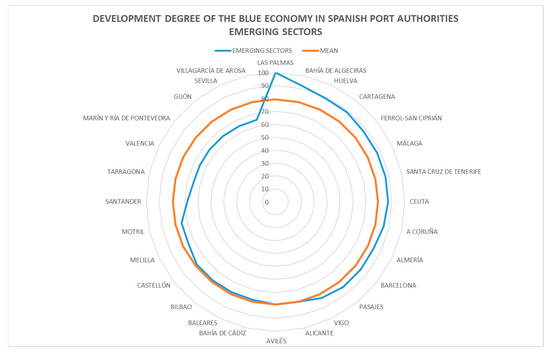 To conclude this analysis of results, it should be noted that if the degree of development of the economic sectors established in Spain as a whole is measured, coastal tourism, port activities, and maritime transport clearly stand out, all of them above 95% development (Figure 11); however, the marine renewable energy sector barely exceeds 40%. Thus, a very uneven development between sectors can clearly be observed. If the emerging sectors are analyzed (Figure 12), it can be seen that practically all port authorities are developing projects related to the economic sectors of infrastructure, research, and security; the sector that is in the lowest position among the emerging sectors in terms of the degree of implementation is blue biotechnology, at just over 50%.