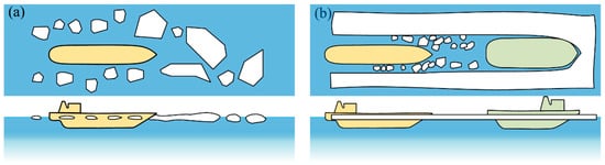 Ship navigation scenarios in an icy region: (a) Navigation in an ice floe region; (b) Navigation in a broken-ice region when guided by an icebreaker.